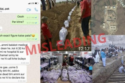 नकली व्हाट्सएप्प चैट के साथ, तस्वीरों का एक सेट सफेद कफ़न में लिपटी लाशों को दिखलाता है।