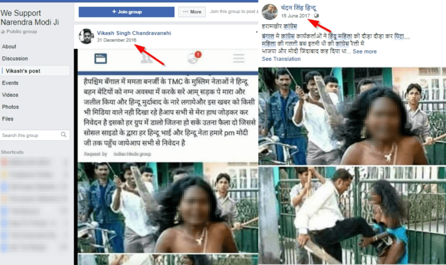 31 अगस्त को एक फेसबुक उपयोगकर्ता हिंदू अखिलेश गुप्ता ने पुरुषों के एक समूह द्वारा एक महिला को नग्न करने और सड़क पर दौड़ाकर पीटने की तस्वीर शेयर की। फोटो को प्रसारित करने के लिए कहा गया कि पश्चिम बंगाल में कोंग्रेस की रैली में भाजपा-समर्थक और मोदी-समर्थक नारे लगाने पर कांग्रेस कार्यकर्ताओं ने इस हिंदू महिला की पिटाई कर दी। इस पोस्ट को 15,000 बार शेयर किया गया।