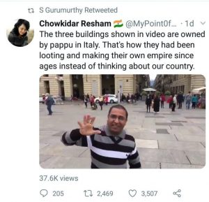 फेसबुक पेज मेरा भारत महान से, इस वीडियो को 1.5 लाख से अधिक बार देखा गया है और लगभग 13,000 शेयर हुए हैं। “इटली से आयी पप्पु की सच्चाई देखो ओर दूसरो को भी दिखाओ।” यह कैप्शन उस वीडियो के साथ है। वीडियो में, उस व्यक्ति को गुजराती में यह कहते सुना जा सकता है, “राजीव गांधी के बेटे, पप्पू, वह उनकी इमारत है। उन्होंने पूरे देश को लूटने के बाद इस इमारत को खरीदा। मैं इटली में हूं और यह राजीव और सोनिया गांधी की इमारत है। इन तीनों इमारतों से भारत में बैठकर पप्पू पैसा कमाता है। उनका व्यवसाय इन संपत्तियों को किराए पर देना है। उसने भारत को लूटा है। पप्पू को खत्म करो और उसे भारत से बाहर निकाल दो। जय श्री कृष्ण मैं इटली में हूं।” -(अनुवाद)