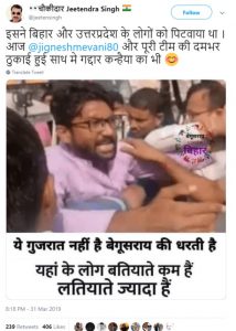 “बेगूसराय से एक बढ़ीया ख़बर आ रही है। वामपंथी जीग्नेश मेवाणी को बेगूसराय के कीसी राष्ट्रवादीने थप्पड़ों से नवाज़ा है।” – सोशल मीडिया के इस दावे के अनुसार बेगूसराय, बिहार में किसी ‘राष्ट्रवादी’ ने जिग्नेश मेवाणी को थप्पड़ मारा। यह संदेश एक तस्वीर के साथ प्रसारित किया जा रहा है जिसमें मेवाणी को भीड़ के साथ हाथापाई जैसी स्थिति में दिखलाया गया है। यह दावा, CPI के कन्हैया कुमार की उम्मीदवारी पर प्रचार करने के लिए गुजरात विधायक की हालिया यात्रा की पृष्ठभूमि में किया गया है।