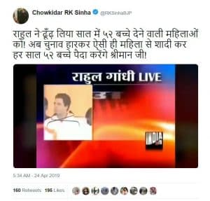 भाजपा सांसद आरके सिन्हा ने राहुल गांधी के भाषण का इंडिया टीवी का एक वीडियो इस संदेश के साथ ट्वीट किया, “राहुल ने ढूँढ़ लिया साल में ५२ बच्चे देने वाली महिलाओं को! अब चुनाव हारकर ऐसी ही महिला से शादी कर हर साल ५२ बच्चे पैदा करेंगे श्रीमान जी!”