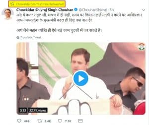 इन शब्दों को भाजपा नेता और मध्य प्रदेश के पूर्व मुख्यमंत्री शिवराज सिंह चौहान ने ट्वीट किया, इसके साथ उन्होंने कांग्रेस अध्यक्ष राहुल गांधी की एक वीडियो क्लिप भी साझा की है। यह वीडियो क्लिप 13 सेकंड की।