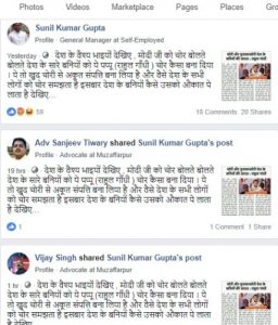 यह तस्वीर, ज्यादातर व्यक्तिगत यूजर्स द्वारा फेसबुक पर एक संदेश के साथ शेयर की गई है, जिसमें लिखा है, “देश के वैश्य भाइयों देखिए, मोदी जी को चोर बोलते बोलते देश के सारे बनियों को ये पप्पू (राहुल गांधी) चोर कैसा बना दिया। ये तो खुद चोरी से अकूत संपत्ति बना लिया है और वैसे देश के सभी लोगों को चोर समझता है इसबार देश के बनियों कैसे उसको औकात पे लाता है देखिए…”