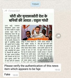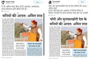 “राजस्थान विधानसभा चुनाव प्रचार के दौरान भाजपा के राष्ट्रीय अध्यक्ष अमित शाह ने विवादास्पद बयान देते हुए देश के बनिया समाज और व्यापारियों की तुलना चोरों से कर डाली। राजस्थान के बूंदी में आयोजित भाजपा की चुनावी रैली में भाजपा अध्यक्ष ने कहा की चोरी करना तो देश के बनिया और व्यापारियों की आदत है, टैक्स तो चोरी करते ही हैं साथ ही किसानो की बर्बादी का भी मुख्य कारण ये बनिया और व्यापारी वर्ग ही है जो सारा मुनाफा अपनी जेब में डाल जाते हैं।” -यह भूमिका थी नकली समाचार पत्र क्लिप के पुराने संस्करण में, जबकि अभी के नए संस्करण में “अमित शाह” और “भाजपा” को “राहुल गांधी” और “कांग्रेस” से बदल दिया गया है-