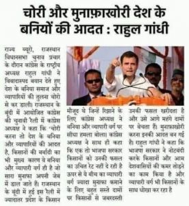“राजस्थान विधानसभा चुनाव प्रचार के दौरान कांग्रेस के राष्ट्रीय अध्यक्ष राहुल गाँधी ने विवादास्पद बयान देते हुए देश के बनिया समाज और व्यापारियों की तुलना चोरों से कर डाली। राजस्थान के बूंदी में आयोजित कांग्रेस की चुनावी रैली में कांग्रेस अध्यक्ष ने कहा की चोरी करना तो देश के बनिया और व्यापारियों की आदत है, टैक्स तो चोरी करते ही हैं साथ ही किसानो की बर्बादी का भी मुख्य कारण ये बनिया और व्यापारी वर्ग ही है जो सारा मुनाफा अपनी जेब में डाल जाते हैं।”