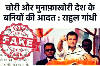 किसी अखबार की क्लिप जैसी दिखने वाली एक तस्वीर सोशल मीडिया और मैसेजिंग प्लेटफार्मों पर शेयर की जा रही है, जिसके अनुसार, कांग्रेस अध्यक्ष राहुल गांधी ने कहा था कि बनिया (व्यापारी) समाज ‘चोर’ है जो मुनाफे के लिए धोखाधड़ी में लिप्त रहता है। इस क्लिपिंग के अनुसार, गांधी ने यह बयान राजस्थान में 2018 के विधानसभा चुनाव से पहले प्रचार अभियान के दौरान दिया था।