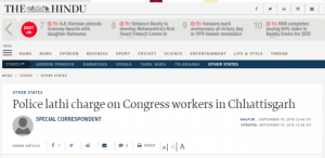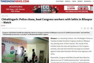 Timesnow के अनुसार “एक चौंका देने वाली घटना में मंगलवार को छत्तीसगढ़ पुलिस ने बिलासपुर शहर में काँग्रेस कार्यकर्ताओ को बेरहमी से पीटा जिससे सात लोग घायल हुए. इस घटना के दृश्य दिखाते है कि शहरी प्रसाशन मंत्री अमर अग्रवाल के खिलाफ प्रदर्शन कर के लौटे हुए कांग्रेस कार्यकर्ताओ पर पुलिस लाठियां बरसा रही है.” – (अनुवादित)
