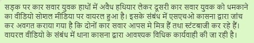 “ग्रेटर नोएडा- दादरी कोतवाली क्षेत्र के ओमिक्रोन सेक्टर के पास 130 मीटर रोड पर दिनदहाड़े कार सवार बदमाश दूसरी कार में सवार को दिखा रहा है हथियार,आई10 कार सवार ने डर से भगाई कार,लाइव वीडियो”– इस संदेश के साथ सोशल मीडिया में एक वीडियो साझा किया गया है, जिसमें सड़क पर एक गाड़ी में बैठे हुए व्यक्ति को दूसरी गाड़ी में बैठे हुए लोगों को हथियार दिखाते हुए देखा जा सकता है। इस वीडियो को ट्विटर पर देशबंधु समाचारपत्र के पत्रकार अंशुमन ने साझा किया है।