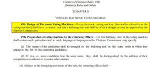 चुनाव संचालन नियम, 1961 के अनुसार, धारा 49ए, इलेक्ट्रॉनिक वोटिंग मशीन की डिजाइन को लेकर है। यह वायरल मैसेज में दावा किए गए ‘चैलेंज वोट’ का उल्लेख नहीं करता। इसमें लिखा है : “प्रत्येक इलेक्ट्रॉनिक वोटिंग मशीन (बाद में वोटिंग मशीन के रूप में संदर्भित) में एक नियंत्रण इकाई और एक बैलेटिंग यूनिट होगी और ऐसे डिज़ाइन होंगे जो चुनाव आयोग द्वारा अनुमोदित हो सकते हैं।” -(अनुवाद)