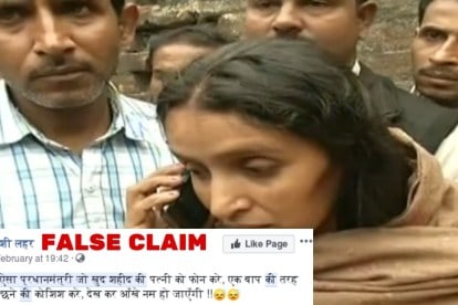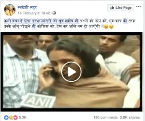 “कभी देखा है ऐसा प्रधानमंत्री जो खुद शहीद की पत्नी को फोन करे, एक बाप की तरह उनके आँसू पोंछने की कोशिश करे, देख कर आँखे नम हो जाएँगी” -यह कैप्शन उस विडियो का है जिसमें एक महिला संभवतः प्रधानमंत्री नरेंद्र मोदी से फोन पर बात कर रही है। पुलवामा आतंकी हमले की पृष्ठभूमि में यह विडियो सोशल मीडिया में वायरल हुआ है। फेसबुक पेज स्वदेशी लहर के इस पोस्ट को अब तक लगभग 2,800 बार शेयर किया गया है।