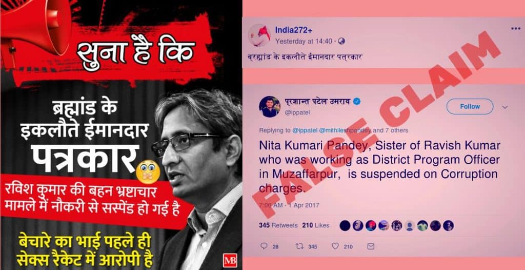 ऑल्ट न्यूज ने पिछले साल अप्रैल में ही रवीश कुमार की बहन के भ्रष्टाचार के आरोप में निलंबित होने के बारे में किए गए दावे को खारिज कर दिया था। तब न्यूजलूज (Newsloose), ट्रोलइंडियनपॉलिटिक्स (TrollIindianpolitics) और दैनिक भारत जैसे नकली समाचार वेबसाइटों ने यह झूठी खबर प्रसारित किए थे।