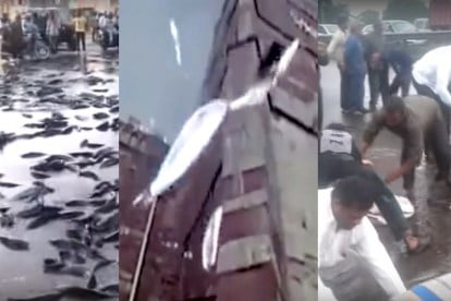 सोशल मीडिया में वायरल एक वीडियो, जिसमें पहली फ्रेम में मछलियों को आसमान से बारिश की तरह गिरते हुए देखा जा सकता है। दूसरी फ्रेम में आप लोगों को सड़क पर फैली हुई मछलियों को इक्क्ठा करते हुए देख सकते हैं। यह वीडियो मुंबई में मछलियों की बारिश होने के दावे से वायरल है।