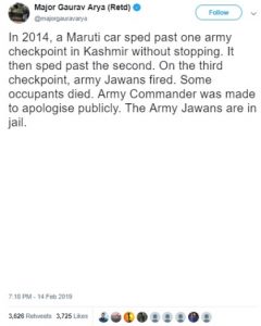 महबूबा मुफ्ती के राज्य-काल में श्रीनगर के बाहर तीन चेक पोस्ट लगे थे आर्मी के। एक कश्मीरी सज्जन आये बड़ा गुस्सा उनको आया, कि मुझको रोका, चेक क्यों किया जा रहा है? वो पहले बेरियर से क्रेश करते हुए गए दूसरे बेरियर को क्रेश किया, तीसरे बेरियर पर हताश होके बोलने के बाद भी जब नहीं रोका तो सिपाही ने फायर खोला, और वो मारे गए। बवाल खड़ा हो गया साहब भारत की जालिम फ़ौज, ये फ़ौज क्यों तंग कर रही है लोगों को? और वहां पर महबूबा मुफ्ती ने ensure किया कि वो जो बेचारा जवान जिसने फायर खोला था आज वो तिहाड़ जेल में है। जो आर्मी कमांडर थे उस वख्त के जनरल हुड्डा साहब, उनको बुलाकर पब्लिक apology देनी पड़ी और वो बैरियर-सेरियर वह से हटा दिए। आज अगर यह गाड़ी क्लियर निकल जाती है, तो कौन जिम्मेदार है? क्या महबूबा मुफ्ती जवाब देगी? आज उन 30 लाशों को, उन 30 परिवारों को?