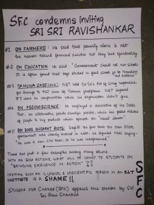 अपने विरोध पर्चे में छात्रों ने लिखा कि “श्री श्री रविशंकर के कई बयान अंधविश्वास को बढ़ावा देता है. उन्होंने आत्महत्या कर रहे किसानों के लिए उनमें आध्यात्मिक कमी को जिम्मेदार ठहराया था. यही नहीं वो चाहते हैं कि सरकार द्वारा कोई भी स्कूल चलाया जाए. वो हमेशा निजीकरण के पक्ष में रहे हैं.”