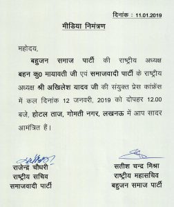 पत्रकारों के निमंत्रण के लिए दोनों पार्टियों ने संयुक्त रूप से प्रेस निमंत्रण जारी किया है. प्रेस कॉन्फ्रेंस कल गोमती नगर के होटल ताज में आयोजित है.
