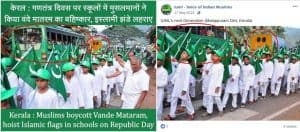 हाथों में हरे रंग का झंडा थामे बच्चों की एक तस्वीर गणतंत्र दिवस के मौके पर सोशल मीडिया पर प्रसारित होनी शुरू हुई। दावा किया गया है कि मुस्लिम स्कूलों के बच्चों ने वंदे मातरम का बहिष्कार किया और इस्लामी झंडे फहराए.