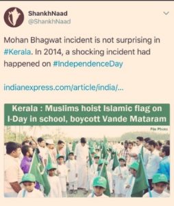 शंखनाद (ShankhNaad), जो काफी भ्रामक सूचनाएं फैला चुका है, उसने भी — यह दावा करते हुए कि यह घटना केरल के एक स्कूल में 2014 में स्वतंत्रता दिवस पर घटित हुई थी — इसे पहले ट्वीट किया था.