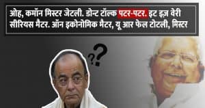 लालू- ओह, कमॉन मिस्टर जेटली. डोन्ट टॉल्क पटर-पटर. इट इज़ वेरी सीरियस मैटर. ऑन इकोनोमिक मैटर, यू आर फेल टोटली, मिस्टर जेटली.
