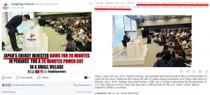 लाफिंग कलर्स ने यह कहते हुए, कि ये जापान के ऊर्जा मंत्री हैं जो जापान के एक गांव में 20-मिनट के लिए बिजली जाने पर प्रायश्चित में झुके हैं, यह तस्वीर अपलोड की। यह बाद में उजागर हुआ कि सवालिया तस्वीर वास्तव में होंडा मोटर कॉर्पोरेशन के नए अध्यक्ष और सीईओ की, जुलाई 2015 में उनके कार्यभार संभालने के बाद उनके पहले प्रेस कांफ्रेंस संबोधन की थी।