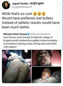 लोकसभा टीवी की जागृति शुक्ला एक बार फिर अपने ट्वीट्स को लेकर विवाद में हैं. इस लेख को लिखते समय, उनके अकाउंट के सस्पेंड होने की वजह से उनके ट्वीट को अब देखा नहीं जा सकता है. पैलेट गन से घायल नागरिकों की चोटों वाली तस्वीरों पर प्रतिक्रिया व्यक्त करते हुए शुक्ला ने ट्वीट किया था, “वाह, यह बहुत अच्छा है। अगर पैलेट (छर्रों) की बजाय असली गोलियां होती तो परिणाम बहुत बेहतर होता– (अनुवादित)”. शुक्ला का ट्वीट, जो कि कश्मीर में न्याय को ताक पर रखकर हत्याओं की मांग करता है, इसे दक्षिणपंथी फ़ॉलोअर्स का समर्थन मिला है. इस तरह कश्मीरियों के ख़िलाफ़ शत्रुता और घृणा की भावनाओं को बढ़ावा दिया गया है. उनकी पोस्ट पर की गईं टिप्पणियां कश्मीरियों के ख़िलाफ़ नफ़रत फैलाने से लेकर उनके उन्नमूलन तक का आह्वान करती हैं.