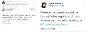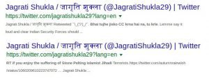 भारतीय सुरक्षा बलों को केवल वास्तविक गोलियों का उपयोग करना चाहिए, यह कहने के बाद, जागृति शुक्ला ने अपने फ़ॉलोअर्स से यहां तक कहा कि यदि वे पत्थरबाज इस्लामिक जिहादी आतंकवादियों के पीड़ित होने से आनंदित हैं तो उनके ट्वीट को रीट्वीट करें। उनके अकाउंट के निलंबन की वजह से उनके ट्वीट को अब देखा नहीं जा सकता है.