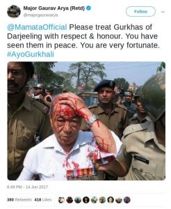 3. जून 2017 में, गोरखा विरोध प्रदर्शन के दौरान, आर्या ने एक खून से भरे व्यक्ति की तस्वीर इस संदेश के साथ प्रसारित की, “@MamataOfficial कृपया दार्जिलिंग के गोरखाओं के साथ आदर और सम्मान के साथ व्यवहार करें। आपने उन्हें शांति से देखा है। आप बहुत भाग्यशाली हैं।”– (अनुवाद) पता चला कि वह तस्वीर कर्नल डीके राय की थी, जिन्होंने 6/8 गोरखा राइफल्स की कमान संभाली थी। 2008 में गोरखालैंड विरोध प्रदर्शन के दौरान उनपर पुलिस द्वारा हमला किया गया था और उस समय के पश्चिम बंगाल के मुख्यमंत्री बुद्धदेव भट्टाचार्य थे।