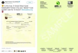 1. मार्च 2017 में, आर्या ने एक पैथोलॉजी रिपोर्ट की तस्वीर ट्वीट करके दावा किया कि यह कश्मीरी अलगाववादी आतंकी और हिज़्ब-उल-मुजाहिदीन के प्रमुख सैयद सलाहुद्दीन की रिपोर्ट है। रिपोर्ट के दावे के अनुसार सलाहुद्दीन एचआईवी पॉजिटिव थे। हमने पाया कि वह तस्वीर फोटोशॉप की हुई थी जो ऑनलाइन उपलब्ध नमूने से बनाई गई थी। रिपोर्ट में इस्तेमाल की गई सलाहुद्दीन की तस्वीर पीटीआई की फाइल फोटो थी।