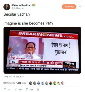तृणमूल कांग्रेस द्वारा कोलकाता में आयोजित महागठबंधन रैली के बाद, सोशल मीडिया यूजर गौरव प्रधान ने पश्चिम बंगाल की मुख्यमंत्री ममता बनर्जी के नाम से एक कथन — “ईमान का नाम है मुसलमान” — का समाचार प्रसारण का स्क्रीनशॉट ट्वीट किया। प्रधान, जिन्हें प्रधानमंत्री नरेंद्र मोदी ट्विटर पर फॉलो करते हैं, भ्रामक सूचना फ़ैलाने के लिए जाने जाते हैं। ऐसे उदाहरणों का एक संग्रह यहां पढ़ा जा सकता है।
