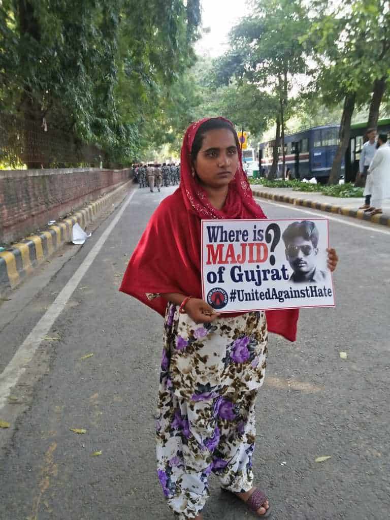 दिल्ली में आशियाना पिछले दो साल से लापता जेएनयू के छात्र नजीब अहमद के लिए मंडी हाउस से जंतर-मंतर तक निकाले जा रहे इंसाफ मार्च में शामिल होने आई हैं। जहां उनकी मुलाकात ऐसी ही एक मां के साथ हुई है जिनका बेटा नजीब अहमद पिछले दो साल से लापता है। उसकी तरह नजीब की मां भी अपने बेटे को खोजने के लिए मोदी सरकार से गुहार लगाने और कई मंत्रियों-नेताओं से भी बातचीत से लेकर हर संभव रास्ता अपना चुकी हैं। लेकिन, अभी तक दोनों को कोई भी इंसाफ नहीं मिला है। आशियाना के साथ ही एक पोस्टर लेकर मोसिन हिंगोर्ज़ा खड़े हुए हैं। इस पोस्टर पर लिखा हुआ है, “Where is Majid of Gujrat”
