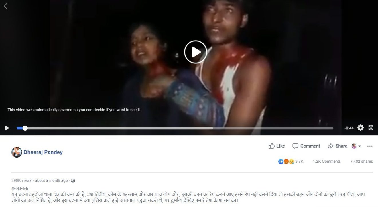 एक युवक-युवती को खून से लथपथ हालत में दिखलाता विचलित करने वाला वीडियो, सोशल मीडिया में उपरोक्त दावे के साथ साझा किया गया कि “शांतिप्रिय समुदाय के लोगों” द्वारा लड़की पर यौन उत्पीड़न हमले का उसके भाई द्वारा विरोध करने पर भाई-बहन को मारा गया। “शांतिप्रिय समुदाय” शब्द का प्रयोग व्यंग्यात्मक रूप से मुस्लिम समुदाय के लिए किया जाता है। इस दावे में “जागो हिंदू जागो” नारे से यह बताया गया कि वीडियो में प्रताड़ित लोग हिंदू समाज के हैं।