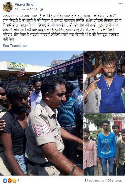 सोशल मीडिया में वायरल एक अफवाह में दावा किया गया कि कुछ तस्कर निर्दोष लोगों को उनके शरीर के अंगों को बेचने के लिए मार रहे हैं। तेलुगु में प्रसारित इस संदेश में दावा किया गया कि भिखारियों के छद्म वेश में बिहार से झारखंड जाने वाले 500 लोग, मेडिकल कॉलेजों और अंगों के अवैध व्यवसायियों को लोगों के शरीर और किडनी बेचने के लिए, उन्हें मार रहे हैं। अफवाह में सुझाया गया कि छह से सात अपराधियों को पुलिस ने पकड़ लिया है।