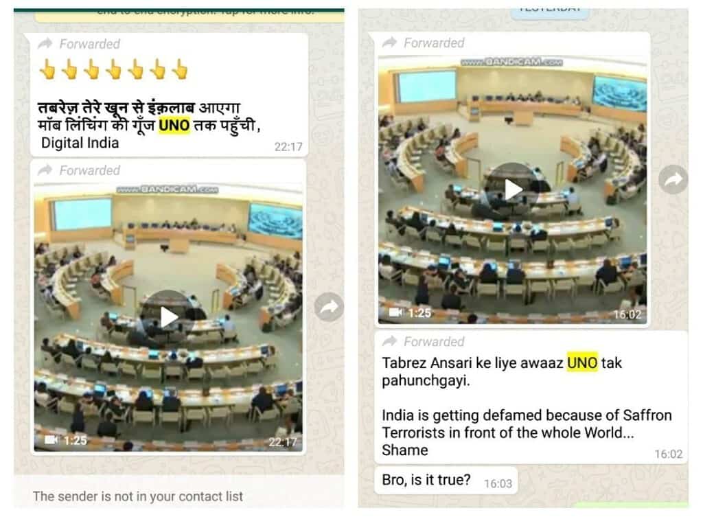 पिछले कुछ दिनों से एक वीडियो क्लिप इस दावे के साथ सोशल मीडिया में प्रसारित की जा रही है कि यह संयुक्त राष्ट्र के एक सम्मेलन की वीडियो है। इस वीडियो में, एक प्रतिनिधि को, झारखंड में हाल ही में तबरेज़ अंसारी की मॉब लिंचिंग द्वारा हुई हत्या के बारे में बोलते हुए सुना जा सकता है, जिसमें तबरेज़ अंसारी को एक खंभे से बांधा गया था और ‘जय श्री राम’ बोलने के लिए मजबूर किया गया था।