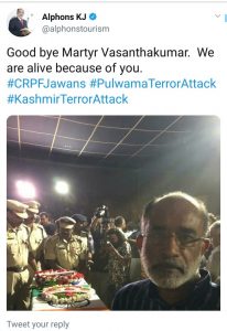 आजतक की ख़बर के अनुसार के.जे अल्फोंस बीते शनिवार को पुलवामा हमले में मारे गए जवान वीवी वसंत कुमार के अंतिम संस्कार में हिस्सा लेने के लिए कोझीकोड हवाई अड्डे पहुंचे थे.