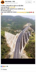 यही तस्वीर थोड़े बदले हुए संदेश के साथ पोस्ट किया गया जिसमें कहा गया है, “उत्तर के एक्सप्रेस वे ओर पूर्वोत्तर के डबलडेकर पुलों के बाद अब पश्चिम भारत मुंबई-गोवा NH66 कशेडी घाट !! बताने की जरूरत नही है किसने किया …क्यो की वो तो यही कहेंगे मोदी ने क्या किया है।”