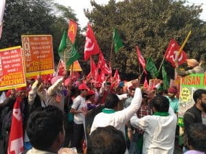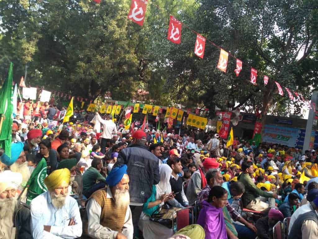 दिल्ली का रामलीला मैदान, वही मैदान जिसके चारों तरफ औद्योगिक इमारतें खड़ी हैं और जो कई ऐतिहासिक आंदोलनों का गवाह रहा है. जहां आज से साढ़े सात साल पहले अन्ना आंदोलन में विशाल जनसमूह उमड़ा था. एक बार फिर से वही मैदान “भीख नहीं रोजगार चाहिए, जीने का अधिकार चाहिए”, “किसान एकता ज़िंदाबाद” और “मोदी सरकार होश में आओ” जैसे नारों से गूंज रहा है. इस बार मसला है देश के अन्नदाता का, उनका जो अपने श्रम से देश की विशाल जनसंख्या का सृजन करते आए हैं. दो दिन के इस आंदोलन में 29 नवंबर की सुबह से ही रामलीला मैदान में लाल, पीले, हरे और सफेद रंग के झंडे आसमान में लहराने लगे थे. मिट्टी की ज़मीन पर बिछी मैली दरी पर बैठे कुछ लोग थकान मिटा रहे हैं तो कुछ आगे की रणनीति बनाने में जुटे हैं.