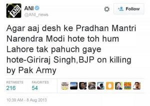 8 जनवरी, 2013. जब पाकिस्तानी रेंजरों द्वारा दो भारतीय सैनिकों के सिर काट दिए गए तो प्रधानमंत्री मोदी ने कहा था कि “मैं देख रहा हूं कि पाकिस्तान भारतीय सैनिक का सर काट रहा है और हिंदूस्तान सर झुका रहा है. ऐसा मैंने कभी देखा नहीं. भारत को स्वाभिमान के साथ जीना होगा. इन वीर जवानों के लहू को बेकार नहीं जाने देना चाहिए. भारत इस प्रकार असहाय अनुभव करे. इसके लिए पूरी तरह केंद्र सरकार को जिम्मेवार ठहराता हूं. उनकी नीतियों को..उनके क्रियाकलापों को..देश उन्हें कभी माफ़ नहीं करेगा.”