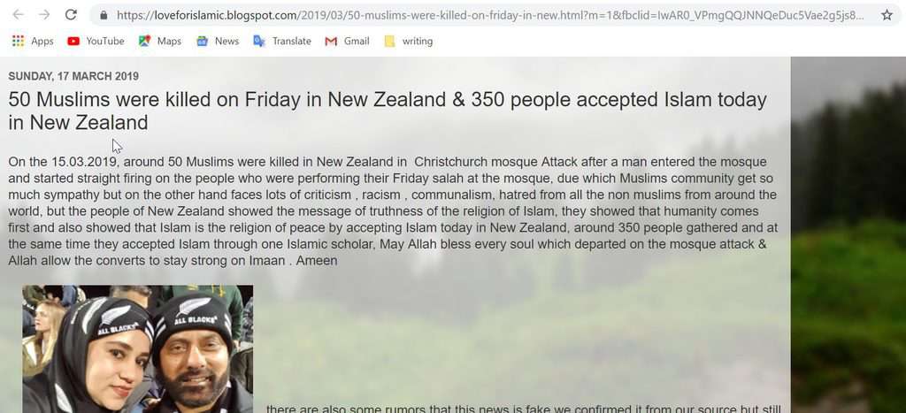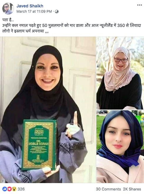 ट्विटर पर कई लोगों ने 17 मार्च 2019 को प्रकाशित एक ब्लॉग के आधार पर यह दावा शेयर किया है। इस ब्लॉग का शीर्षक है, “शुक्रवार को न्यूज़ीलैंड में 50 मुस्लिमों की हत्या की गई और आज न्यूज़ीलैंड में 350 लोगों ने इस्लाम स्वीकार कर लिया”। – (अनुवाद) इसके अनुसार, क्राइस्टचर्च नरसंहार के बाद 350 लोग इस्लाम में परिवर्तित हो गए। इस ब्लॉग के साथ एक जोड़े की तस्वीर थी जिसमें महिला हिजाब पहने हुए दिखती है। अकेले फेसबुक पर इसे लगभग 3.8 लाख शेयर मिले हैं।