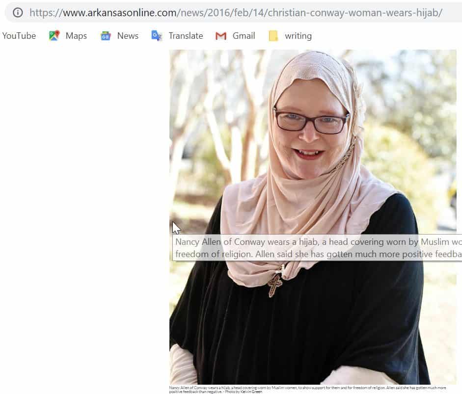 2. अमरीकी अखबार Arkansas Democrat-Gazette  के 14 फरवरी 2016 के ऑनलाइन संस्करण में प्रकाशित एक लेख के अनुसार, अमरीका के साउथ केरोलिना की क्रिश्चियन महिला नैंसी एलन ने मुस्लिम महिलाओं और धर्म की स्वतंत्रता के समर्थन में हिजाब पहना था।