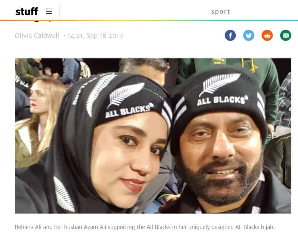 1. यह तस्वीर उस महिला से संबंधित है जिन्होंने न्यूज़ीलैंड की राष्ट्रीय रग्बी टीम ऑल ब्लैक्स के समर्थन में ‘रग्बी हिजाब’ डिज़ाइन किया था। न्यूज़ीलैंड की एक वेबसाइट Stuff द्वारा 18 सितंबर 2017 को एक लेख के साथ प्रकाशित ऐसी ही तस्वीर के नीचे कैप्शन में लिखा है, “अपने विशिष्ट रूप से डिज़ाइन किए गए ऑल ब्लैक्स हिजाब में ऑल ब्लैक्स का समर्थन कर रहीं रेहाना अली और उनके पति आज़म अली”। – (अनुवाद)