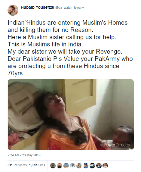 इस प्रकार एक संपादित वीडियो क्लिप को पाकिस्तानी सोशल मीडिया पर प्रसारित किया गया, इसे साझा करने वालों में मंत्री भी शामिल है, जिन्होंने अनुच्छेद 370 को अप्रभावी करने के फैसले के बाद कश्मीर में हो रही क्रूरता को दिखाने का प्रयास किया था।