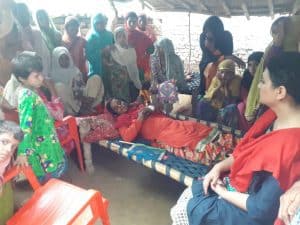 असमीना और रकबर के सात बच्चे हैं। रकबर की बड़ी बेटी वहां बैठी औरतों को पानी भी पिला रही है जो करीब 12 साल की है। बाकी बच्चे आसपास बैठे हुए हैं।