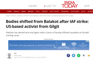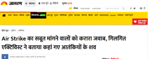 2. दूसरी भ्रामक रिपोर्ट, जिसे इस लेख में पहले खारिज किया जा चुका है, वह था — “IAF के हवाई हमले के बाद बालाकोट से मृत शरीर हटाए गए”। 13 मार्च को दैनिक जागरण ने एक लेख प्रकाशित किया जिसका शीर्षक था — “Air Strike का सबूत मांगने वालों को करारा जवाब, गिलगित एक्टिविस्ट ने बताया कहां गएआतंकवादियों के शव”