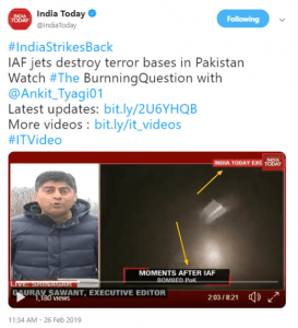 इंडिया टुडे ने अपने 26 फरवरी के प्रसारण में कई मीडिया संगठनों की इस घोषणा, कि “स्रोतों के अनुसार, बालाकोट हवाई हमले में 300 आतंकवादी मारे गए” का दावा किया।