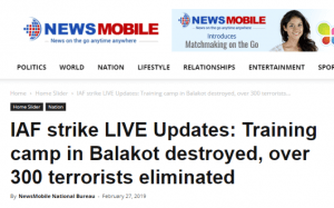 1. फेसबुक के तथ्य-जांच भागीदारों में से एक अन्य, न्यूज़मोबाइल ने 27 फरवरी को “300 आतंकवादी मारे गए” की असत्यापित संख्या वाली खबर दी। कहने की जरूरत नहीं कि इस संख्या के समर्थन में सरकार की ओर से कोई आधिकारिक बयान नहीं है।