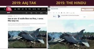 इंडिया टुडे ग्रुप के आज तक को भी पुलवामा हवाई हमले के बाद भ्रामक सूचना प्रसारित करते हुए पाया गया। 27 फरवरी को इस मीडिया संगठन ने “पाक का दावा — दो भारतीय विमान मार गिराए, 1 पायलट जिंदा गिरफ्तार” शीर्षक से एक रिपोर्ट प्रकाशित की, जिसमें ‘मिग प्लेन क्रैश’ कैप्शन के साथ एक गिरे हुए विमान की तस्वीर का उपयोग किया। ऑल्ट न्यूज़ ने खोज की कि विमान की वह तस्वीर, जिसके एलओसी के निकट पाकिस्तान में गिरने का दावा किया गया, वह तीन साल पुरानी थी और उड़ीसा के मयूरभंज जिले में गिरे भारतीय वायुसेना के लड़ाकू प्रशिक्षण विमान की थी।