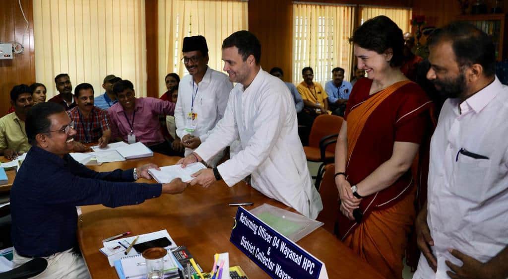कांग्रेस अध्यक्ष राहुल गांधी ने गुरुवार को वायनाड लोकसभा सीट से नामांकन दाखिल किया. गांधी यहां अपनी बहन प्रियंका गांधी, के सी वेणुगोपाल तथा मुकुल वासनिक सहित कांग्रेस के वरिष्ठ नेताओं के साथ पहुंचे.