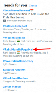 13 फरवरी की सुबह से, एक खास ट्विटर हैशटैग, तेजी से बढ़ते हुए इस माइक्रो-ब्लॉगिंग वेबसाइट पर दिन के बड़े ट्रेंड्स में शामिल हो गया था। हैशटैग #RahulGandhiPagalHai के साथ एक जैसे ट्वीट कई यूजर्स द्वारा पोस्ट करने से यह टॉप ट्रेंड में बदल गया।