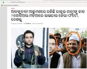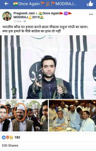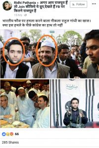 “भारतीय फौज पर हमला करने बाला नीकला राहुल गांधी का खास। क्या इस हमले के पीछे कांग्रेस का हाथ तो नहीं” -यह संदेश एक फेसबुक यूजर प्रग्णेश जानी द्वारा फेसबुक ग्रुप ‘वन्स अगेन मोदीराज 2019‘ में पोस्ट किया गया। इस पोस्ट में तीन तस्वीरें शामिल हैं। इनमें से एक में कांग्रेस अध्यक्ष राहुल गांधी, पुलवामा के आत्मघाती हमलावर के साथ देखे जा सकते हैं, आदिल अहमद डार दूसरी तरफ हैं। बाकी दो तस्वीरें राहुल गांधी और आदिल अहमद डार की हैं।