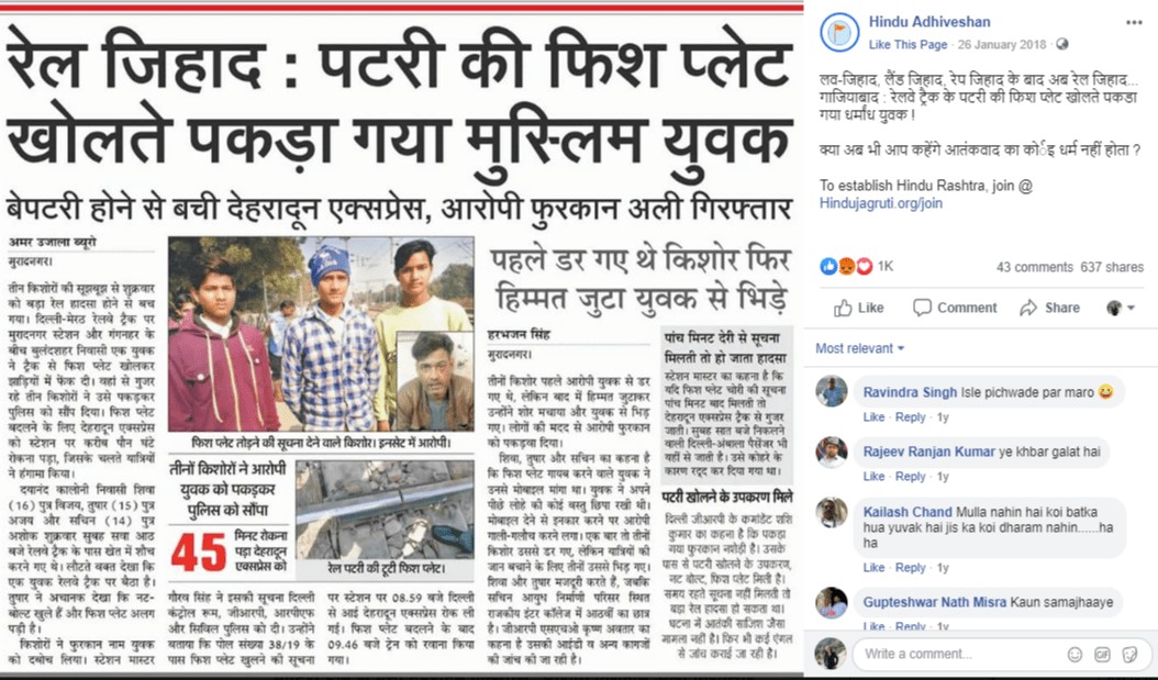 हमने पाया की यह तस्वीर ट्विटर और फेसबुक पर 2018 से प्रसारित है। इस तस्वीर को फेसबुक पर हिन्दू अधिवेशन नाम के एक पेज ने 26 जनवरी, 2018 को एक संदेश के साथ पोस्ट किया था, “लव-जिहाद, लैंड जिहाद, रेप जिहाद के बाद अब रेल जिहाद…गाजियाबाद : रेलवे ट्रैक के पटरी की फिश प्लेट खोलते पकडा गया धर्मांध युवक! क्या अब भी आप कहेंगे आतंकवाद का कोर्इ धर्म नहीं होता ?”। इस पोस्ट को 1000 लाइक और 600 से अधिक बार साझा किया गया है।