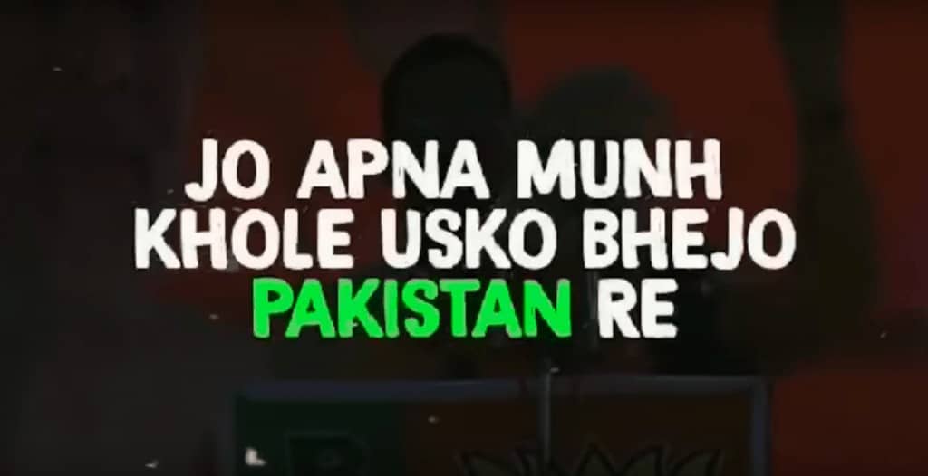 इसके बाद यह गाना भाजपा की विचारधारा को बताती है (एकता की हत्या बोलो राम नाम सत्य है…. जनता की आंख पे पर्दा तु खींच दे). वहीं, पुलवामा आतंकी हमला और बालाकोट हवाई हमले के बाद भाजपा द्वारा शहीदों के नाम पर वोट मांगने को लेकर भी मोदी सरकार पर निशाना साधा गया है (बूथ की हो बात तो शहीद को भी बेंच…ऊंची दुकान पर जहरीला पकवान… फ* योर फकीरी तेरा पर्यावेट विमान…वार का है शौक इसे ये बंदा आदमखोर है).